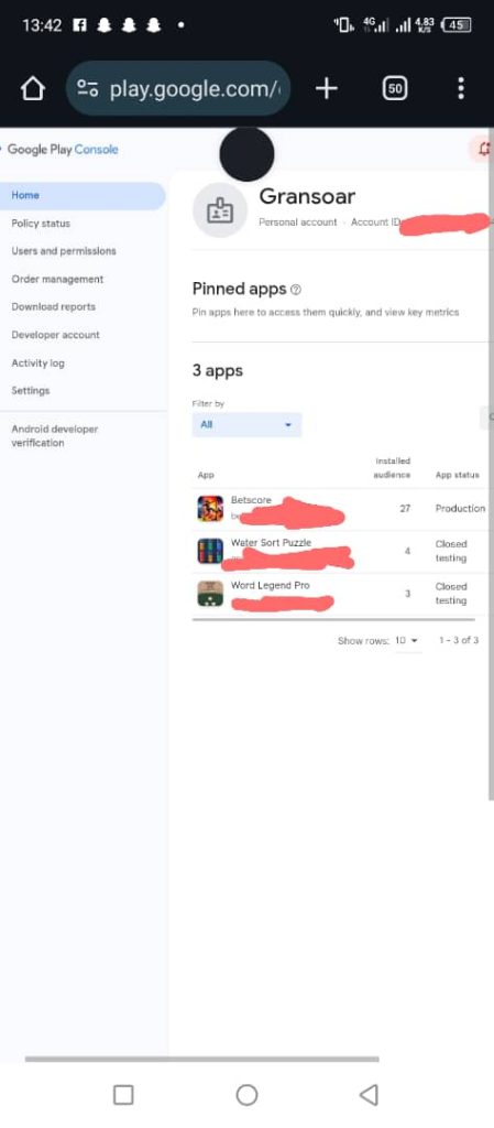 1 Live App Google Play Console Account Available [100+ Downloads]