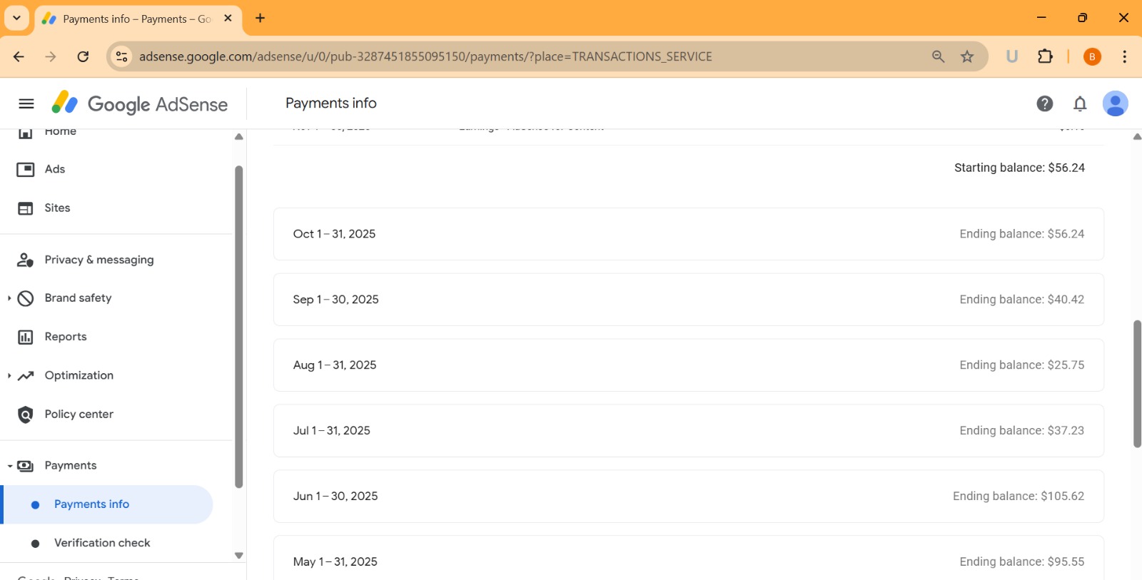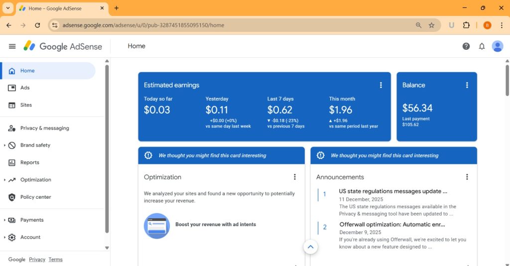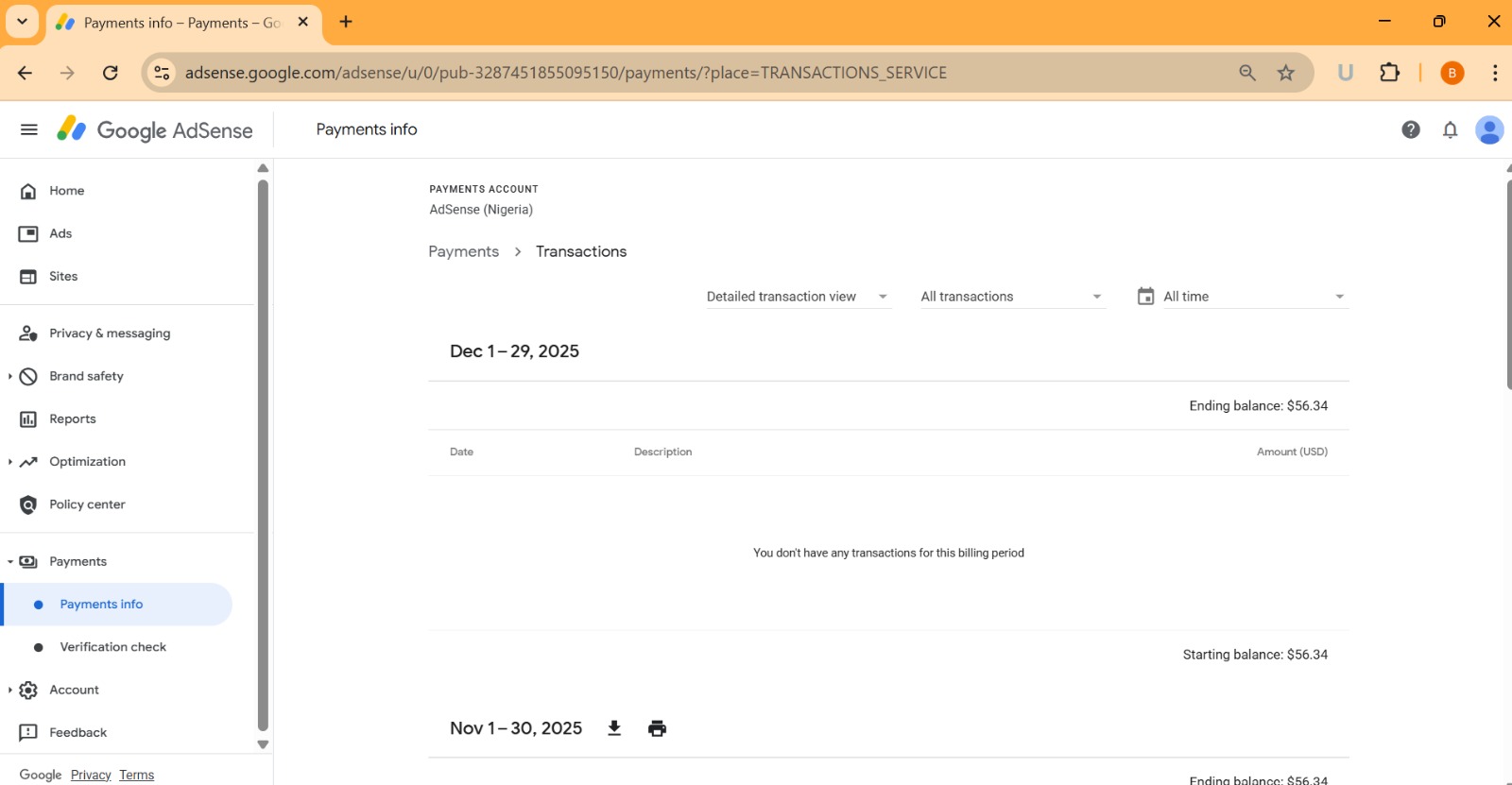 ✅1x payment received Nigeria AdSense account available✅1x payment received✅1+ years old acct✅.com domain live (sustainability niche)✅Ads manager not created✅not used for adx✅ads live✅$105 received.✅last payment July 2025, 2025✅$56+ balance