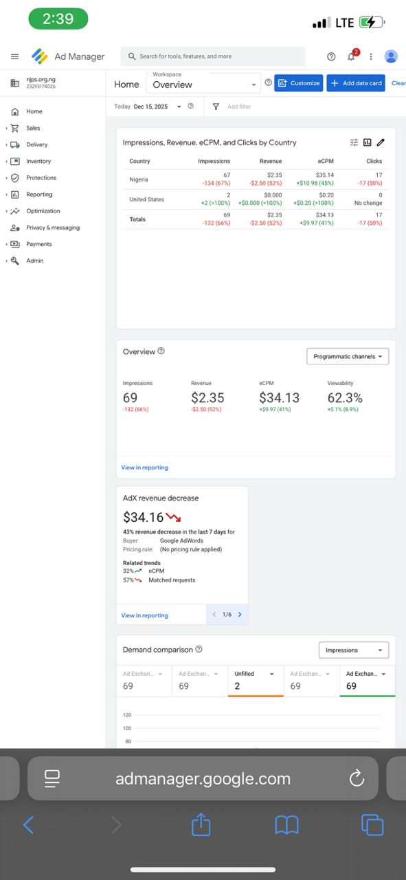 39+X Naija 🇳🇬 AdSense Account Available for sale✅9 Years+ Old✅.com domain/.org.ng – 2 strong domain✅700+ daily page views 800 +✅used for ADX before and Still Live✅Ad Manager Active✅Ads showing Live✅URL for readily buyerDM me let’s deal 🤝