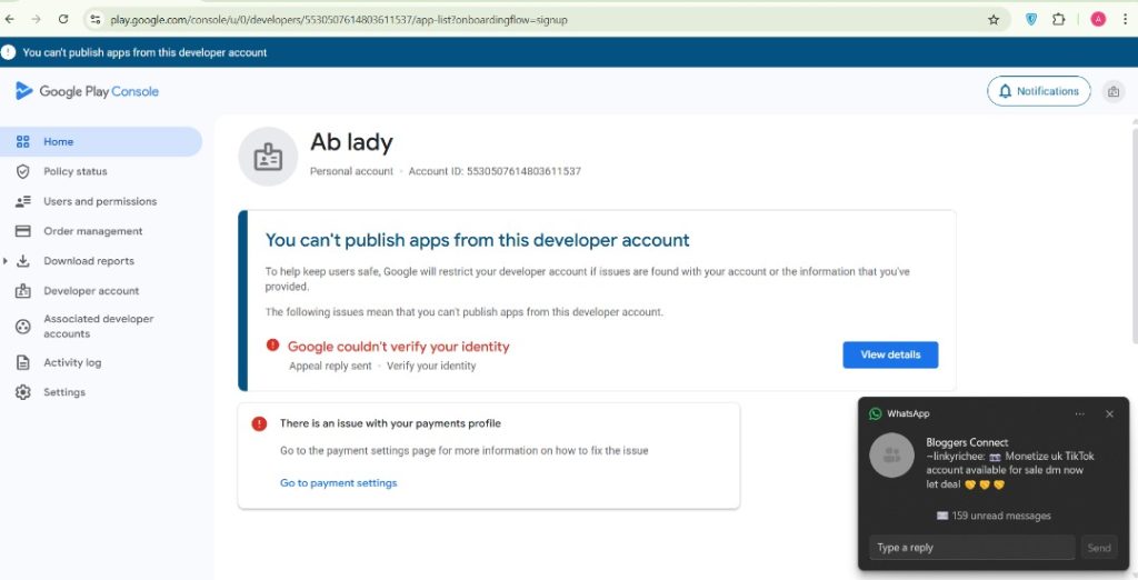 Unverified Play Console Available with zero apps